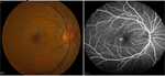Fundus photography and a fluorescein angiogram (FA) were obtained. FA was normal in the right eye but revealed arterial filling of a peripapillary vascular malformation in the left eye without leakage.