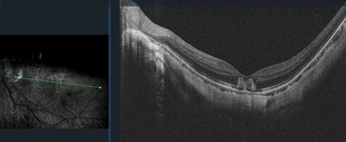 Fluorescein angiography (FA) and optical coherence tomography (OCT) images were also obtained. FA OS showed hyperfluorescence consistent with pooling corresponding to the nasal serous RD, as well as adjacent hyperfluorescent staining. FA OD was unremarkable. Macular OCT OS revealed intact retinal layers and normal foveal contour; however, a scan of the nasal retina showed a well-circumscribed serous RD with associated thickening of the outer retinal layers and overlying vitritis. Again, imaging OD was within normal limits.