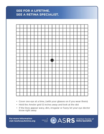 Amsler Grid: Getting older? At risk for age-related macular degeneration (AMD)? Keep an eye on your vision by looking at an Amsler grid, commonly a black grid with lines on a white background and a dot in the middle. Download our Amsler grid and contact your eye doctor immediately if the lines look wavy, dim, irregular, or fuzzy.