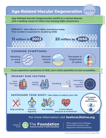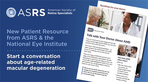 Talk with Your Doctor About AMD: If you or a loved one has recently been diagnosed with age-related macular degeneration (AMD), you likely have questions and concerns about the condition. That's why the ASRS worked with the National Eye Institute to develop the Talk with Your Doctor About AMD guide — to help people start meaningful conversations about AMD at their next appointment. Download, print, or share it on social media today.