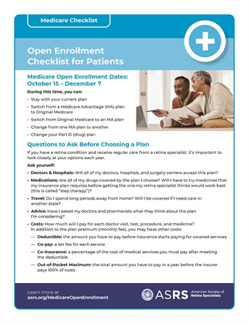 Medicare Open Enrollment Checklist: If you are considering switching plans during Medicare Open Enrollment, don’t proceed without reviewing our Medicare Open Enrollment Patient Checklist. Retina patients should consider several factors before signing up or switching plans to ensure continued access to their retina specialist and needed medications.