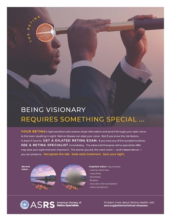 Your clear view of the world relies on healthy retinas. Learn how to care for your retinas to protect good vision. View, download, and order print copies of our retina health poster today.