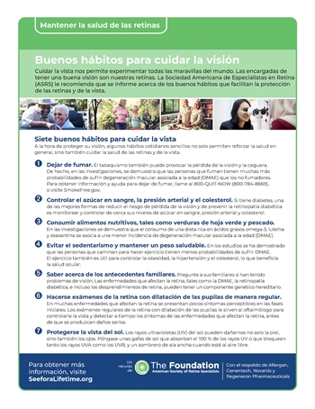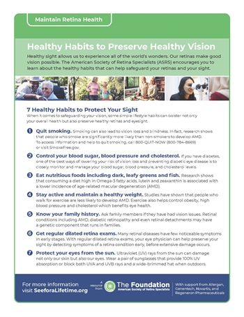 Healthy Habits to Preserve Healthy Vision: Healthy habits today can preserve your retina health in the future. Do you know the seven healthy habits that can not only bolster your overall health, but also protect your healthy retinas and eyesight? Download our Healthy Habits to Preserve Healthy Vision patient guide in English or Spanish to learn more.