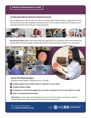 Understanding Retinal Detachment: Retinal detachment can strike suddenly, posing a significant risk of permanent vision loss if not addressed immediately. Protect your vision by learning more about this vision emergency. Download, print, and share this patient guide, which outlines the risks, symptoms, and advanced treatments for retinal detachment.