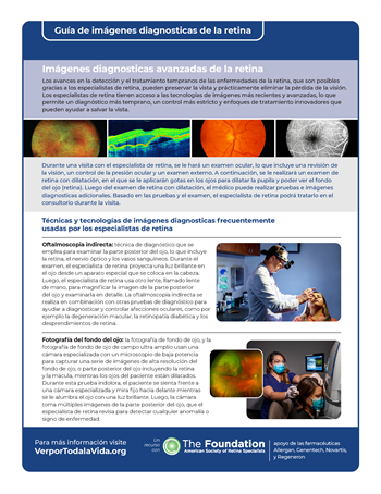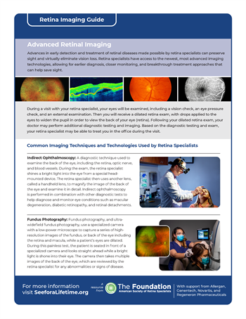 Advanced Retinal Imaging: Advances in early detection and treatment of retinal diseases made possible by retina specialists can preserve sight and virtually eliminate vision loss. Retina specialists have access to the newest, most advanced imaging technologies, allowing for earlier diagnosis, closer monitoring, and breakthrough treatment approaches that can help save sight. Download our Advanced Retinal Imaging patient guide in English or Spanish to learn more.