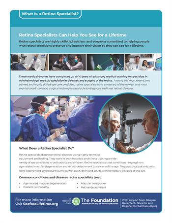 What is a Retina Specialist?: Retina specialists are highly skilled physicians and surgeons committed to helping people with retinal conditions preserve and improve their vision so they can see for a lifetime. Learn more about these highly skilled eye care providers in our new patient guide. Download and print the What is a Retina Specialist patient guide in English or Spanish and share it with friends and family today.