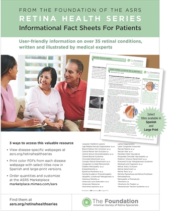 The Retina Health Fact Sheet Series, from the Foundation of the American Society of Retina Specialists, offers condition-specific webpages and printable facts sheets on nearly 40 retinal conditions.