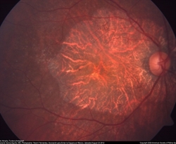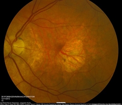Figure 3. Whitish-yellow dots in a reticular, or net-like pattern—termed reticular drusen or reticular pseudo-drusen (RPD) or subretinal drusenoid deposits—are associated with dry-AMD stages, particularly GA. Image by Jeffrey G. Gross, MD, FASRS. Retina Image Bank; Image 1082. © American Society of Retina Specialists.