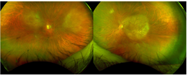 Fundus examination of the right eye revealed a hazy vitreous with scattered microaneurysms around the macula and a 4 mm circular, creamy, yellow-white subretinal lesion 2 disc diameters temporal to the fovea. The left fundus was unable to be visualized. B-scan ultrasound of the left eye revealed a 7.27 mm x 1.56 mm retinal lesion.