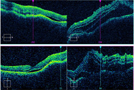 Spectral-domain optical coherence tomography (OCT) revealed bilateral macular retinoschisis without subretinal fluid (Figure 1). OCT scan was also performed through the inferotemporal elevation and confirmed the presence of retinoschisis without retinal detachment (Figure 2). B- and A-scan ultrasound (images not shown) of the left eye’s inferotemporal quadrant revealed a thin, taut area of elevation with a corresponding narrow spike on A-scan consistent with retinoschisis.