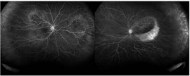 Fundus photographs show hyperemic optic nerves with bilateral occlusive retinal phlebitis with scattered intraretinal hemorrhages. OCT of the macula demonstrates vitreous opacities without cystic retinal changes in both eyes. Fluorescein angiography (FA) demonstrates bilateral disc leakage with central and peripheral venous leakage with areas of peripheral nonperfusion.