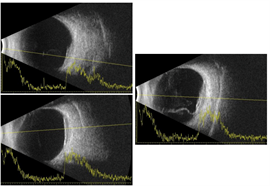 Spectral-domain optical coherence tomography (OCT) showed choroidal elevations with subretinal fluid OD and large choroidal elevation with intraretinal and subretinal fluid OS (Figure 2). Fluorescein angiography (FA) demonstrated two circumscribed areas of punctate hyperfluorescent spots located just above the superior arcade and nasal to the nerve OD and a large circumscribed area of punctate hyperfluorescent spots in the macula with central hypofluorescence OS (Figure 3). A/B scan ultrasonography shows two distinct choroidal hyperechoic lesions with high internal reflectivity in OD with maximal height of 2.90 mm and 2.50 mm and a choroidal hyperechoic lesion with high internal reflectivity with maximal height of 2.97 mm and associated subretinal fluid (Figure 4).