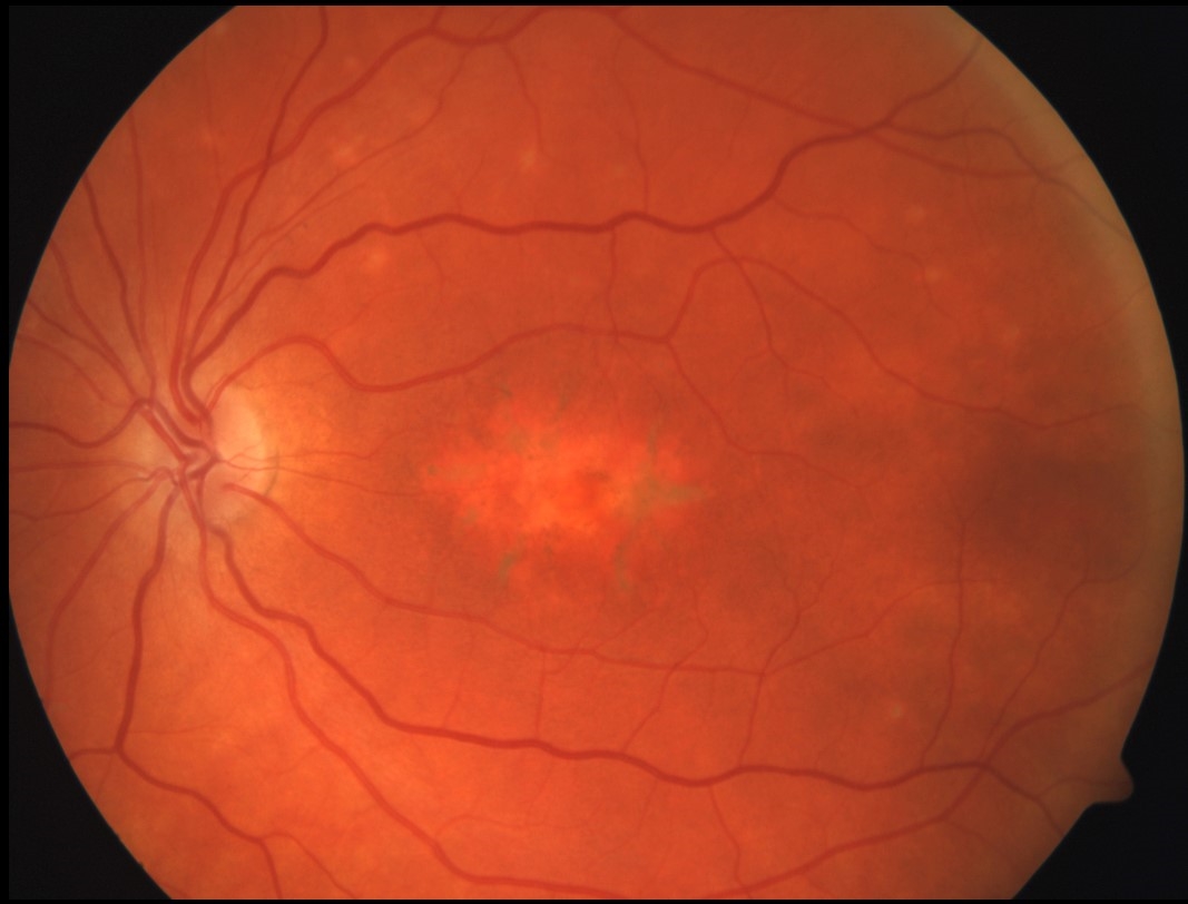 A 57-year-old Caucasian woman presented with decreased visual acuity (VA) in the right eye for 1 month. Ocular history was remarkable for refractive amblyopia (+5D) in the left eye. She denied any ocular history (inflammatory disorders, trauma, family history of hereditary conditions), or medical history.