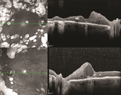 Figure 1. OCT of a patient with bilateral proliferative diabetic retinopathy with diabetic macular edema in the left eye. ©ASRS Retina Image Bank, May 2016. Image 26525. Olivia Rainey, Retina Specialists of Michigan.
