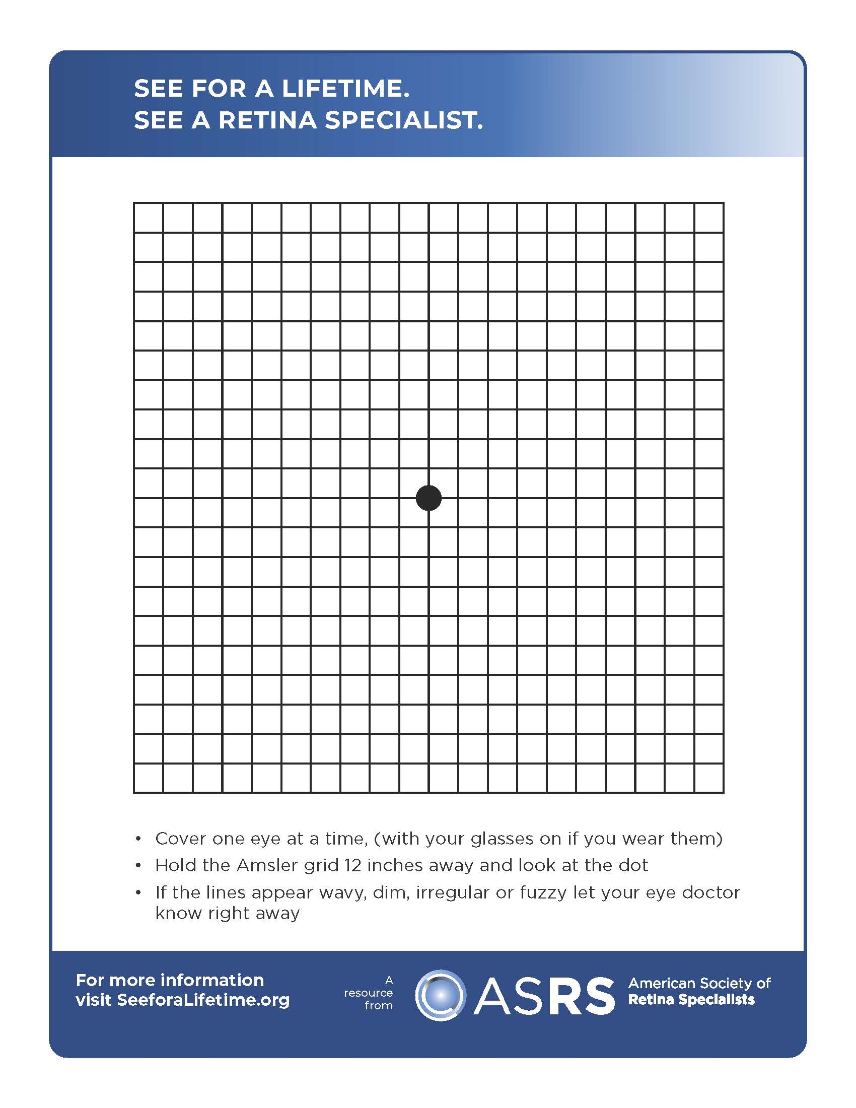 Amsler Grid: Getting older? At risk for age-related macular degeneration (AMD)? Keep an eye on your vision by looking at an Amsler grid, commonly a black grid with lines on a white background and a dot in the middle. Download our Amsler grid and contact your eye doctor immediately if the lines look wavy, dim, irregular, or fuzzy.