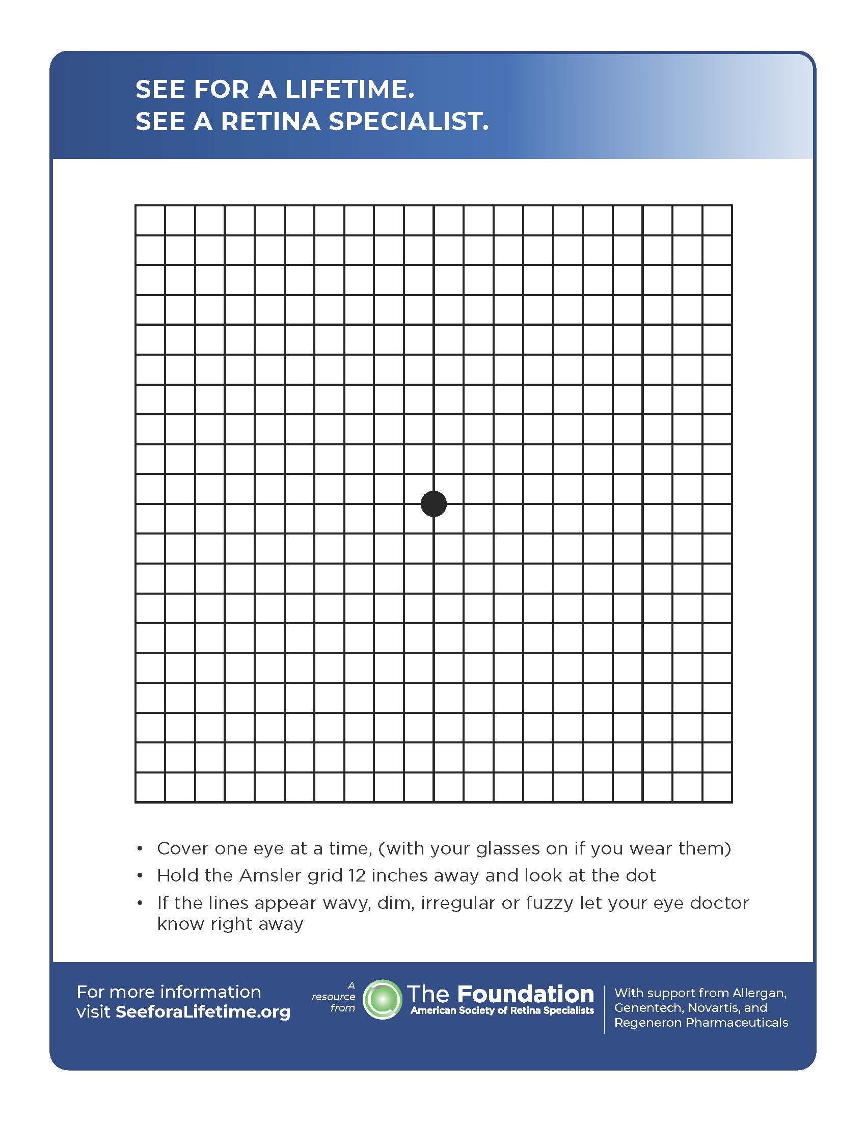 Amsler Grid: Getting older? At risk for age-related macular degeneration (AMD)? Keep an eye on your vision by looking at an Amsler grid, commonly black lines on a white background with a dot in the middle. Download our Amsler grid and contact your eye doctor immediately if the lines look wavy, dim, irregular, or fuzzy.