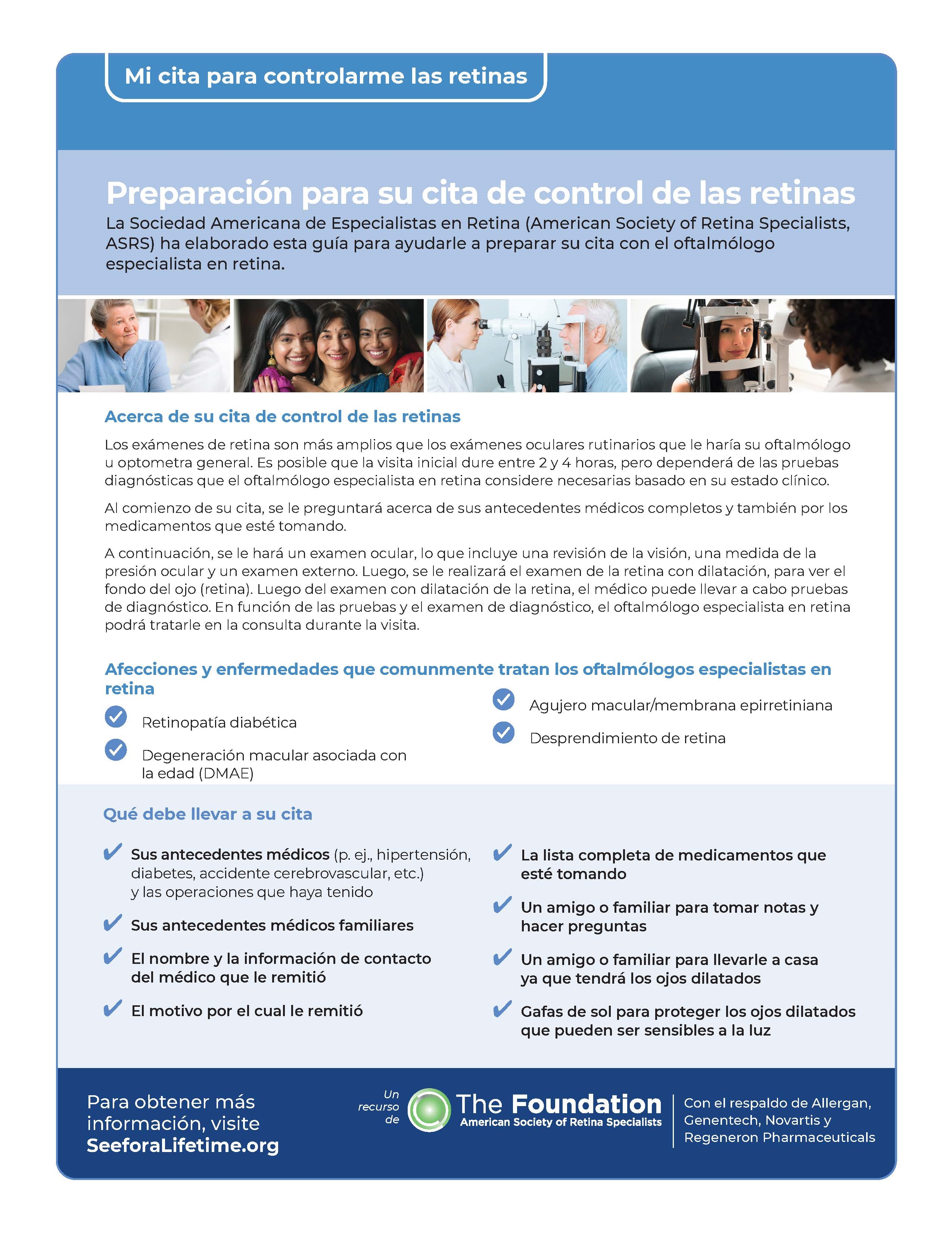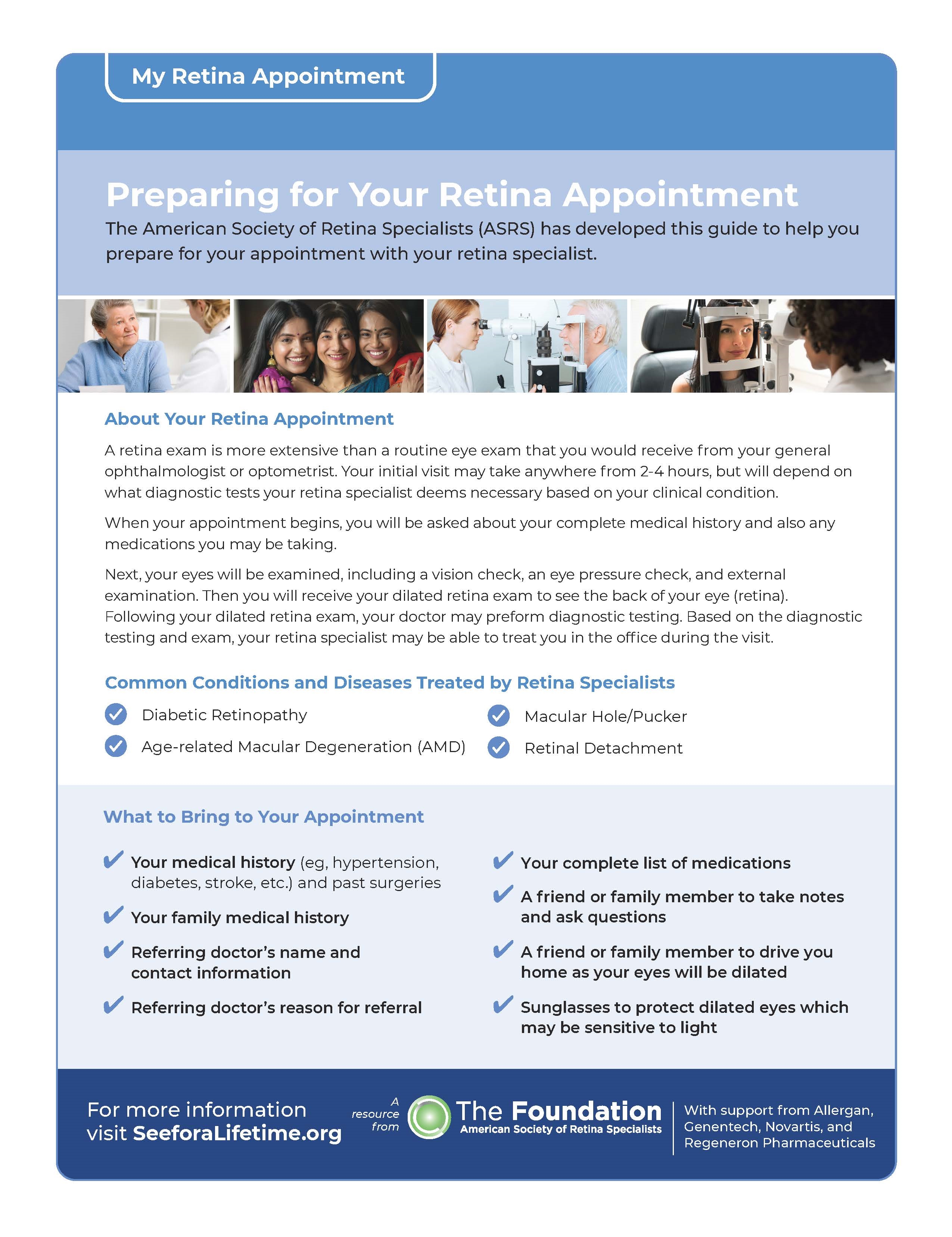 Preparing for Your Retina Appointment: Have an appointment with a retina specialist soon? Download and print this detailed patient discussion guide in English or Spanish, which includes questions you may want to ask your retina specialist to better understand and care for your retinal condition.