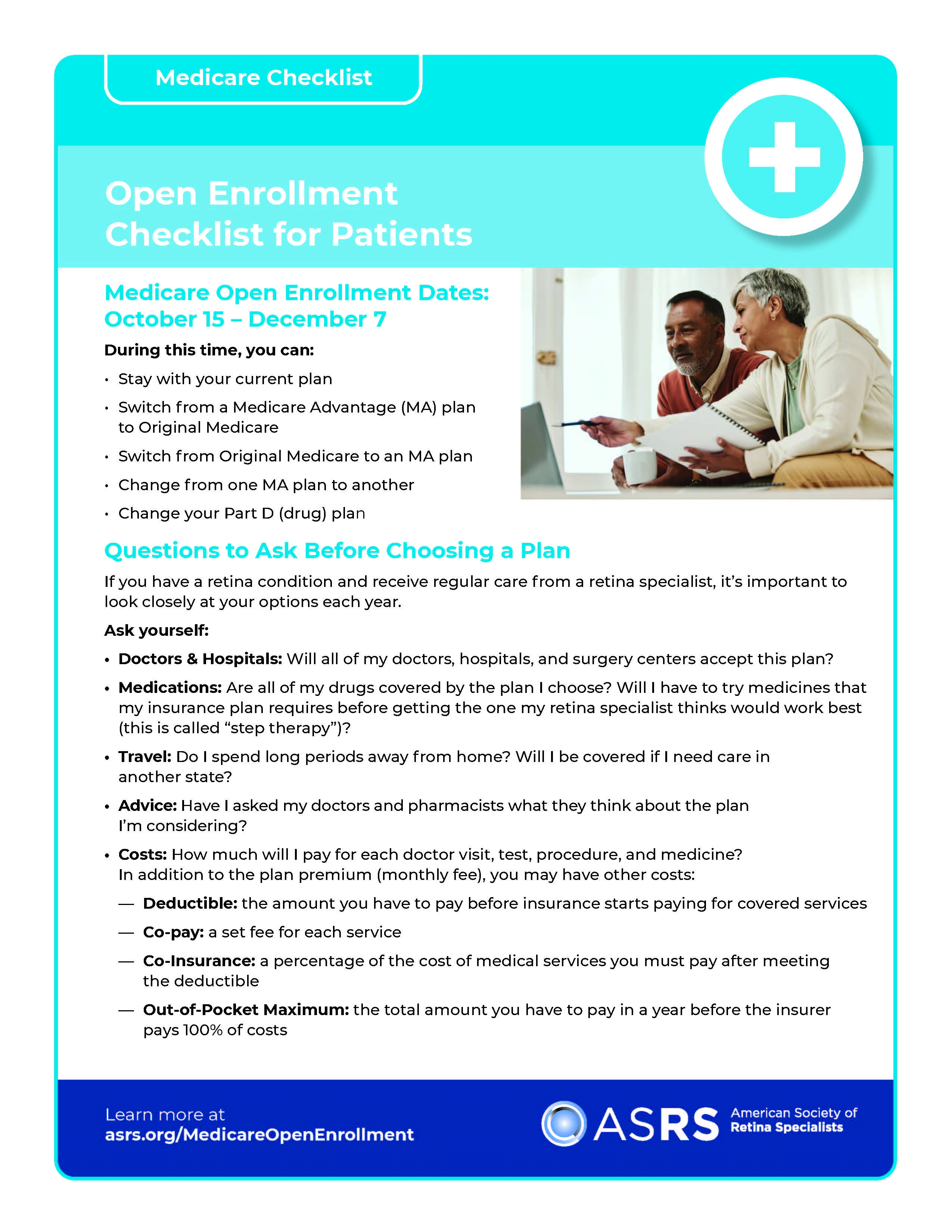 Medicare Open Enrollment Checklist: If you are considering switching plans during Medicare Open Enrollment, don’t proceed without reviewing our Medicare Open Enrollment Patient Checklist. Retina patients should consider several factors before signing up or switching plans to ensure continued access to their retina specialist and needed medications.