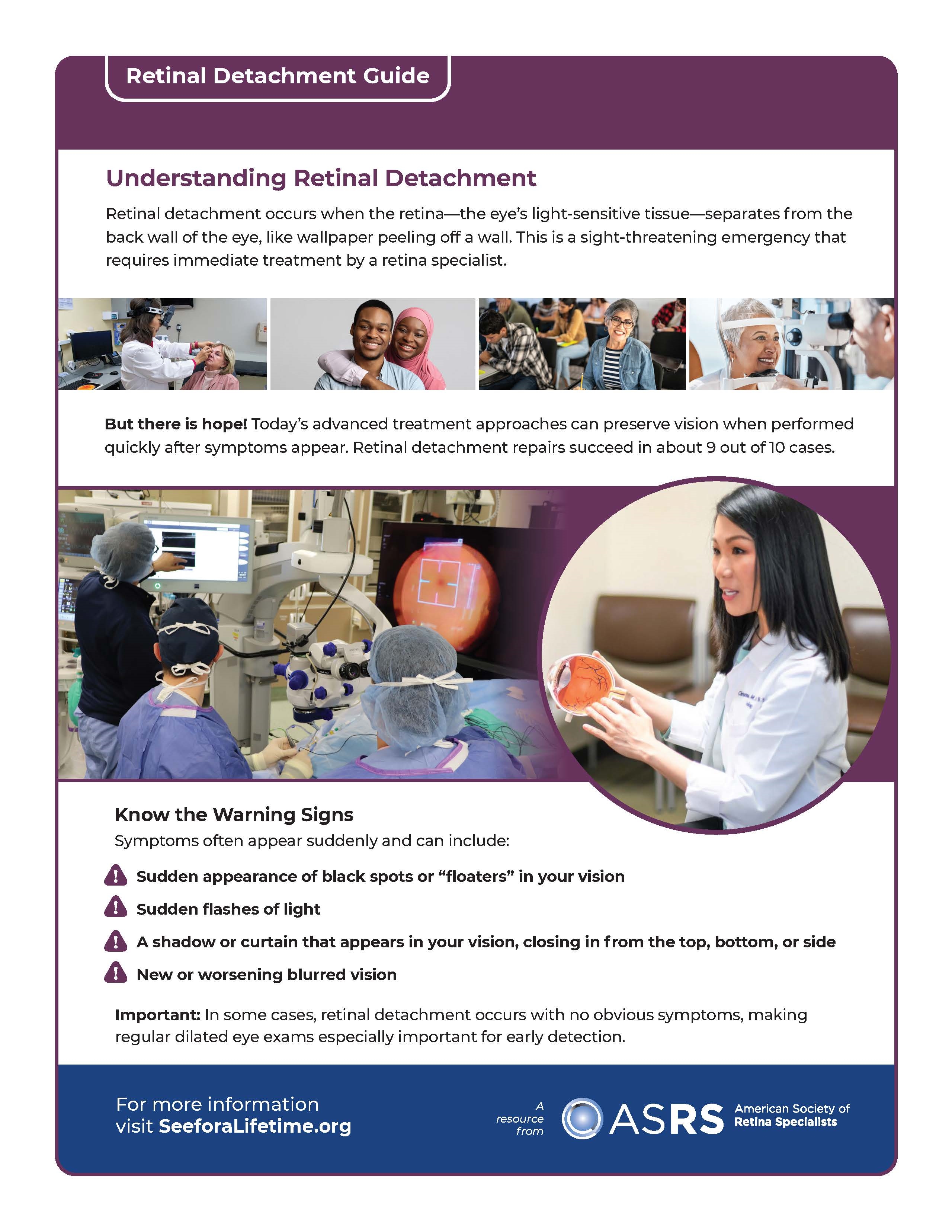 Understanding Retinal Detachment: Retinal detachment can strike suddenly, posing a significant risk of permanent vision loss if not addressed immediately. Protect your vision by learning more about this vision emergency. Download, print, and share this patient guide, which outlines the risks, symptoms, and advanced treatments for retinal detachment.