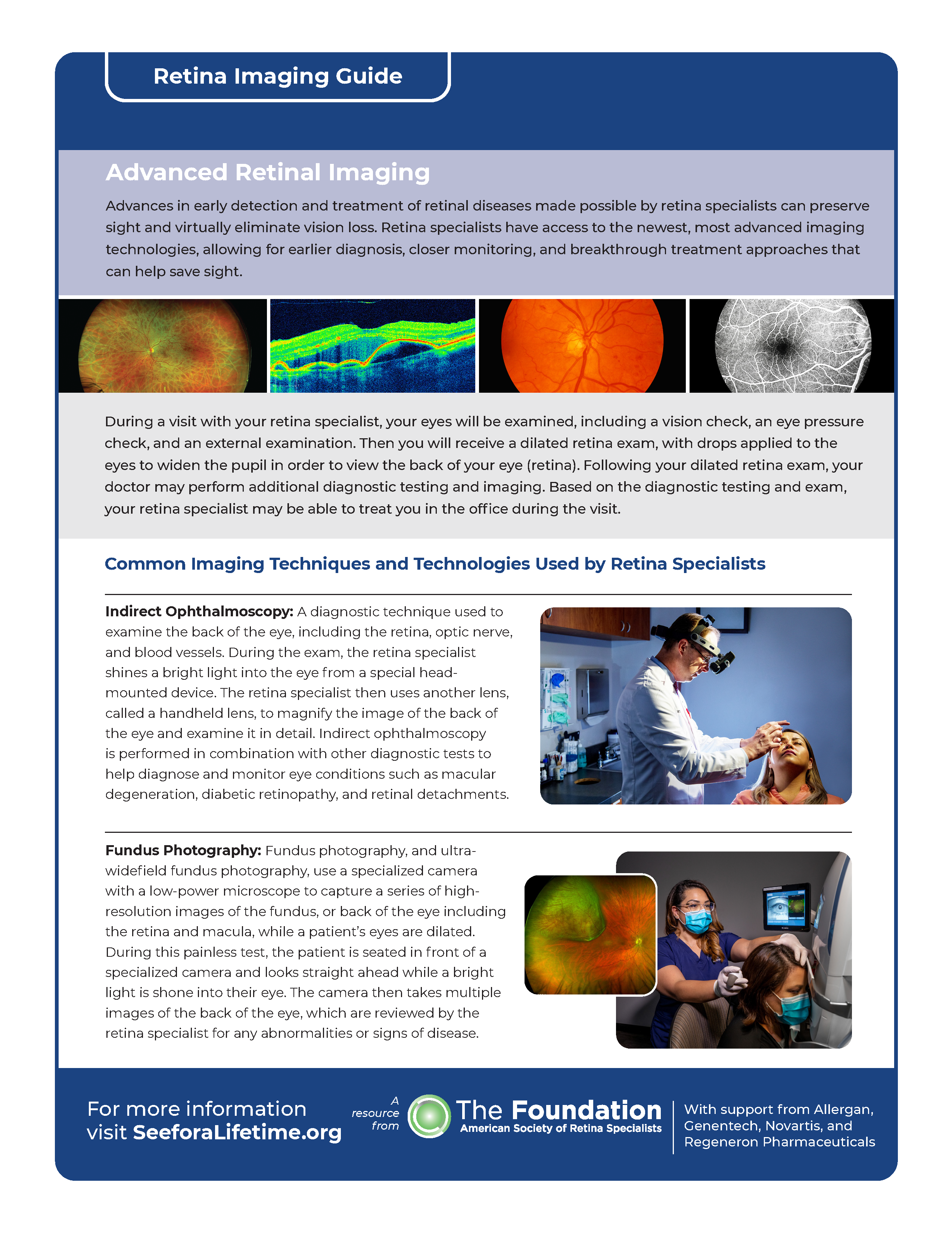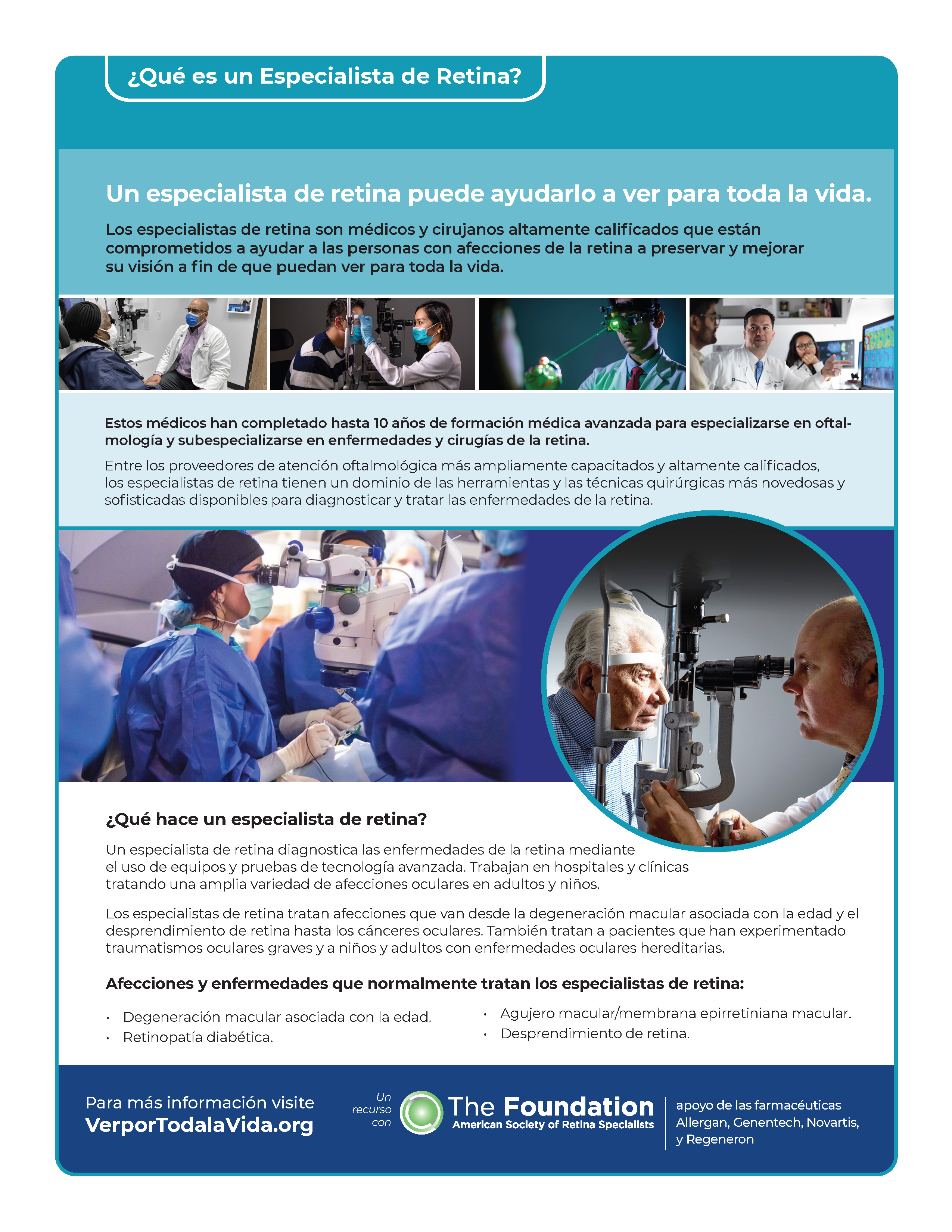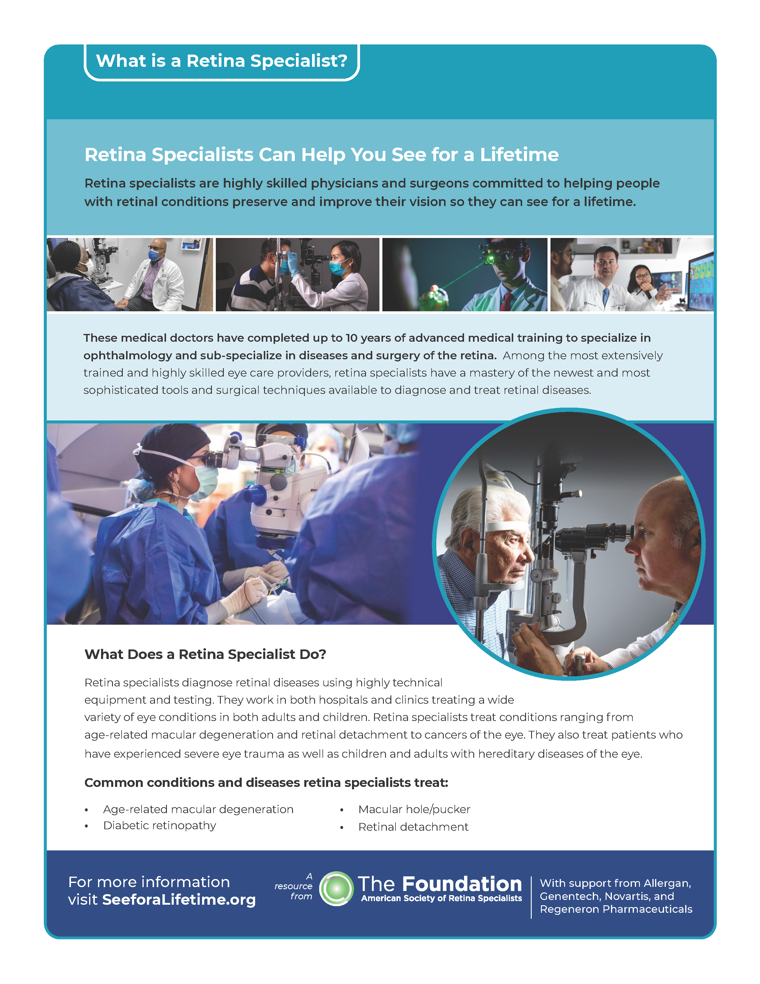 What is a Retina Specialist?: Retina specialists are highly skilled physicians and surgeons committed to helping people with retinal conditions preserve and improve their vision so they can see for a lifetime. Learn more about these highly skilled eye care providers in our new patient guide. Download and print the What is a Retina Specialist patient guide in English or Spanish and share it with friends and family today.