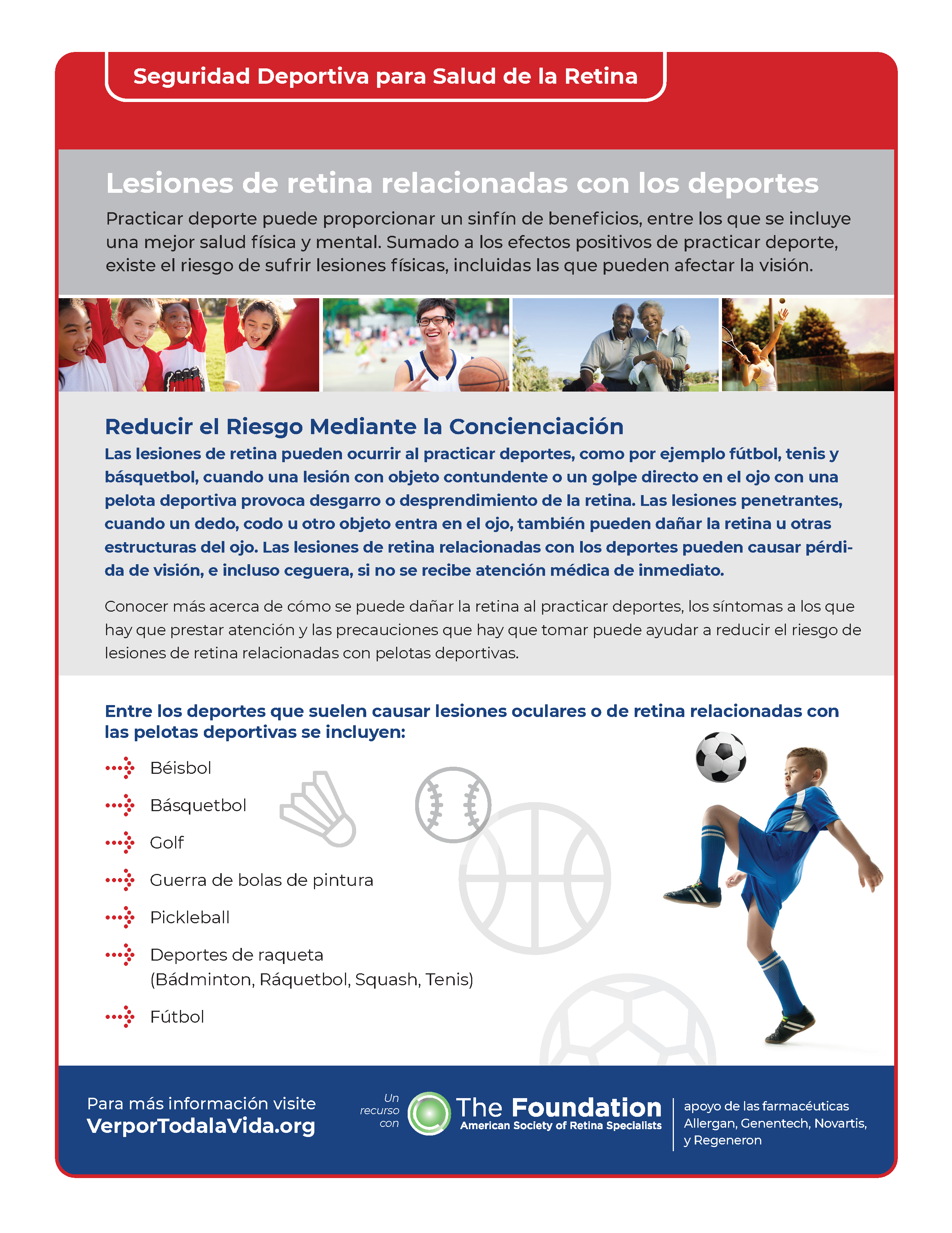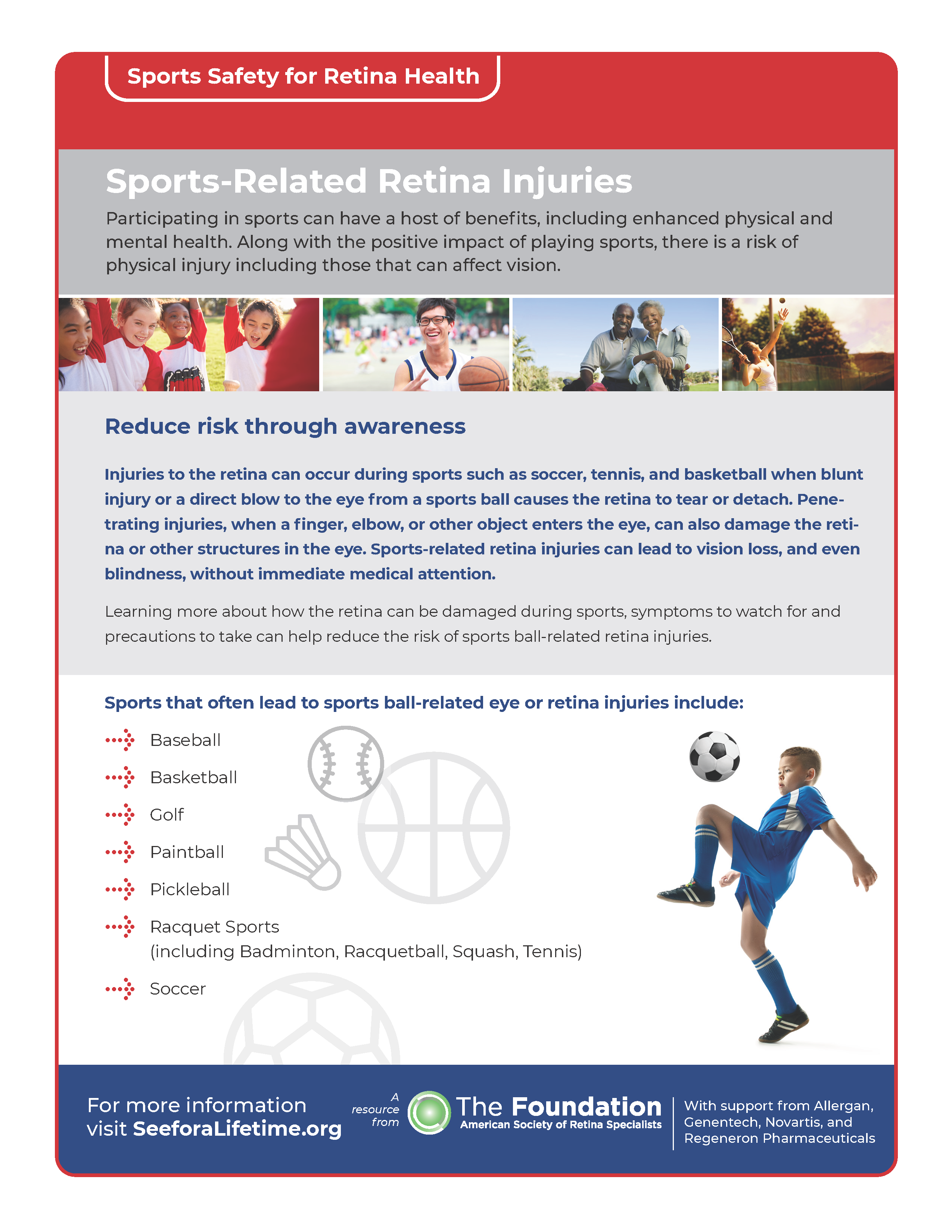 Sports Safety for Retina Health: Participating in sports can have a host of benefits, including enhanced physical and mental health. Along with the positive impact of playing sports, there is a risk of physical injury including those that can affect vision. Download our Sports Safety for Retina Health patient guide in English or Spanish to learn more.