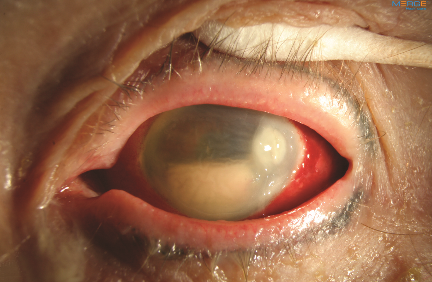 Figure 1. Hypopyon is an accumulation of white blood cells in the anterior chamber of the eye and corneal infiltrate associated with infectious endophthalmitis. Image courtesy of ©Retina Image Bank, contributed by Aleksandra V. Rachitskay, MD, Cole Eye Institute, Cleveland Clinic. 2014. Image 16250.