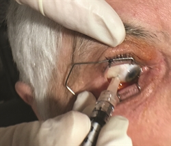 Figure 1. Intravitreal injection of anti-VEGF drug. John T. Thompson, MD. Retina Image Bank, 2017; Image 27125. © American Society of Retina Specialists.