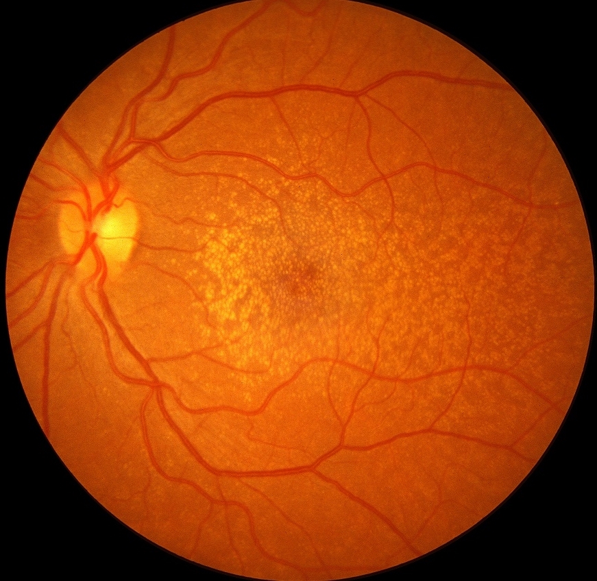 Dry AMD can be further divided into early, intermediate, and late stages. In early stages of dry AMD, small drusen—pale-yellow lesions—form beneath the retina (Figure 1A). Drusen are usually harmless, but as they accumulate, dry AMD can progress. Pigmentary changes can occur along with drusen.