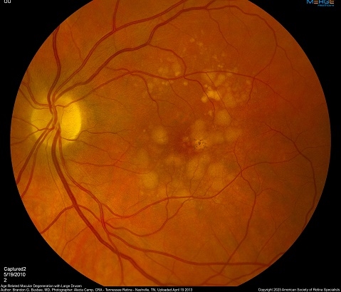 Figure 3. Whitish-yellow dots in a reticular, or net-like pattern—termed reticular drusen or reticular pseudo-drusen (RPD) or subretinal drusenoid deposits—are associated with dry-AMD stages, particularly GA. Image by Jeffrey G. Gross, MD, FASRS. Retina Image Bank; Image 1082. © American Society of Retina Specialists.
