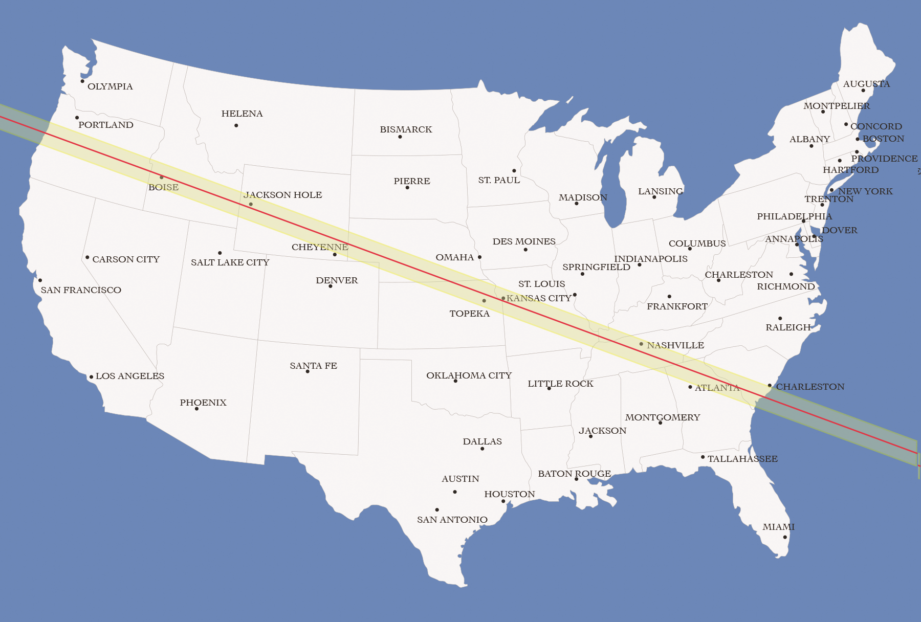 Figure 1. Map of the predicted pathway of the total solar eclipse across the United States on August 21, 2017.