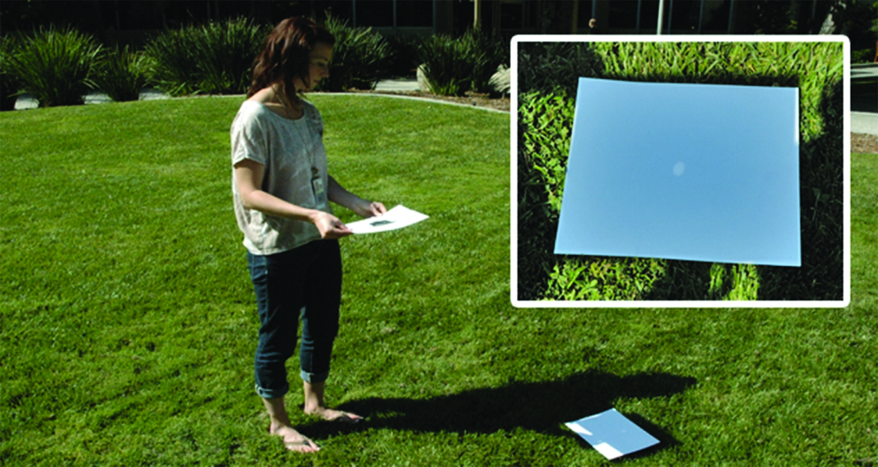 Put a pinhole in the center of a white index card or sheet of paper. Turn your back to the sun and hold the index card up, allowing sun to beam through hole, projecting a solar image onto a paper positioned in front of you. Alignment of surfaces is key; the farther apart, the larger the image appears. Positioning the paper in shade will enhance the image. No filters or shields are used. Remember NOT to look directly through the pinhole into the sun.